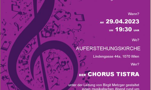 Addresse: AuferstehungskircheLindengasse 44a1070 WienSamstag, 29 April 2023 - 7:30nachmittagsKonzert "Gloria" der CHORUS TRISTA
