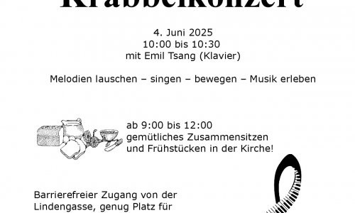 Addresse: AuferstehungskircheLindengasse 44a1070 WienMittwoch, 4 Juni 2025 - 9:00vormittagsKrabbelkonzert